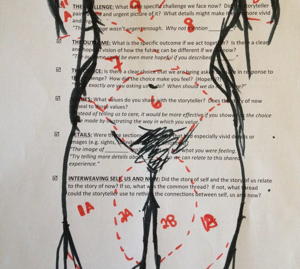 I sit on the floor, still stoned, and draw a woman’s torso, dotted like a butcher’s diagram with red lines.