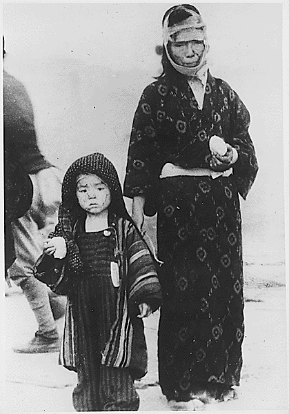 In contrast, Survivors moving along the road after the atomic bombing of Nagasaki, Japan presents the reality on the ground.