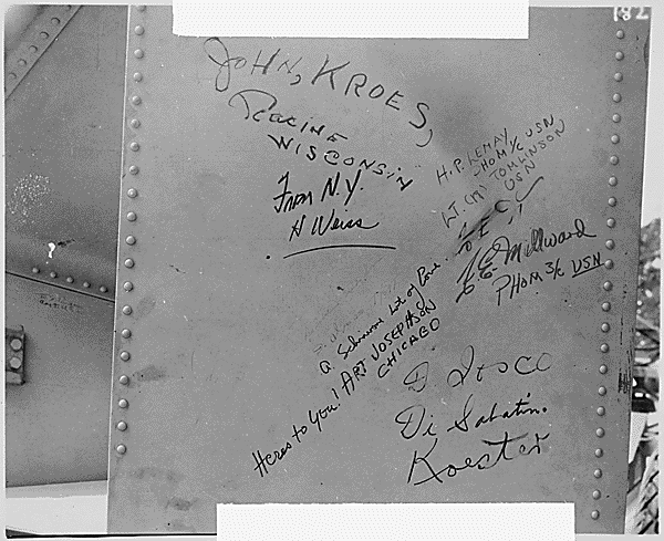 Engineers and soldiers also signed the bombs themselves. Military photographers took this image of Dr. Norman Ramsey, the lead physicist overseeing the nuclear bombing of Japan. He proudly signed “Fat Man,” the bomb the United States dropped on Nagasaki, shortly before the military used it.